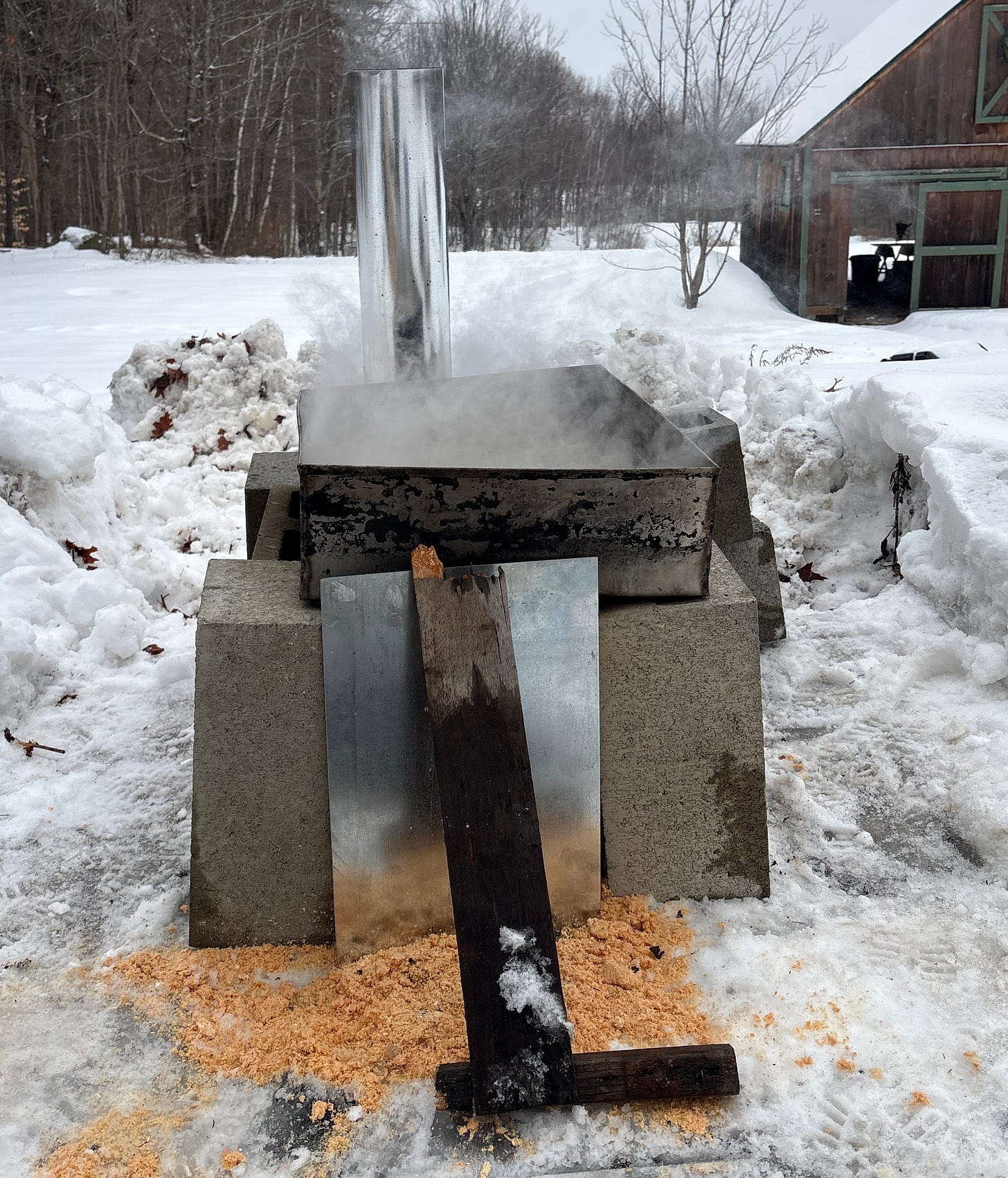 Success! There was Mark’s old evaporator pan, giving off steam on some raw days.