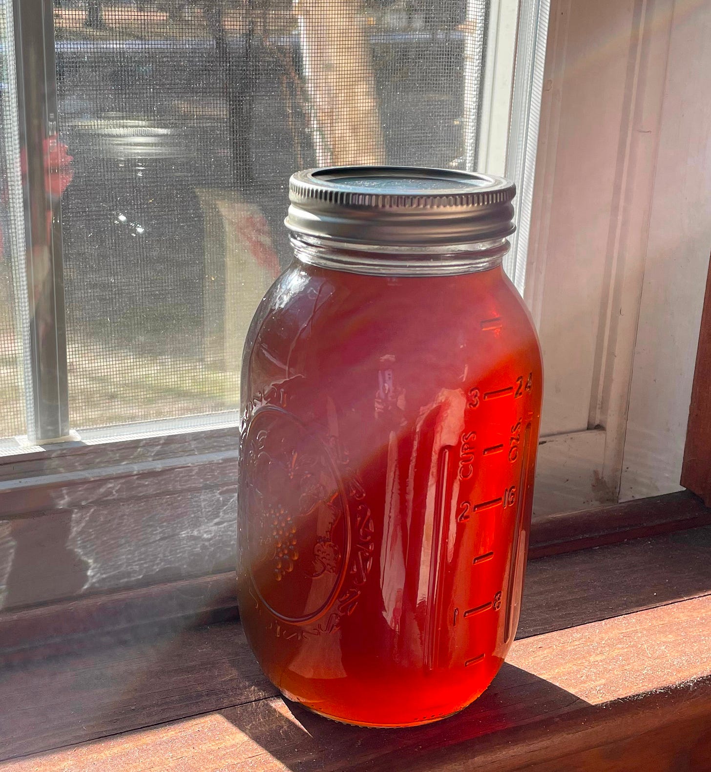 That afternoon, when I left for a run in the sun, the fire was going and the steam was rising again, but — I peered into that big pan to check, and the table by the garage wasn’t operational yet— there was definitely no amber-colored anything around.