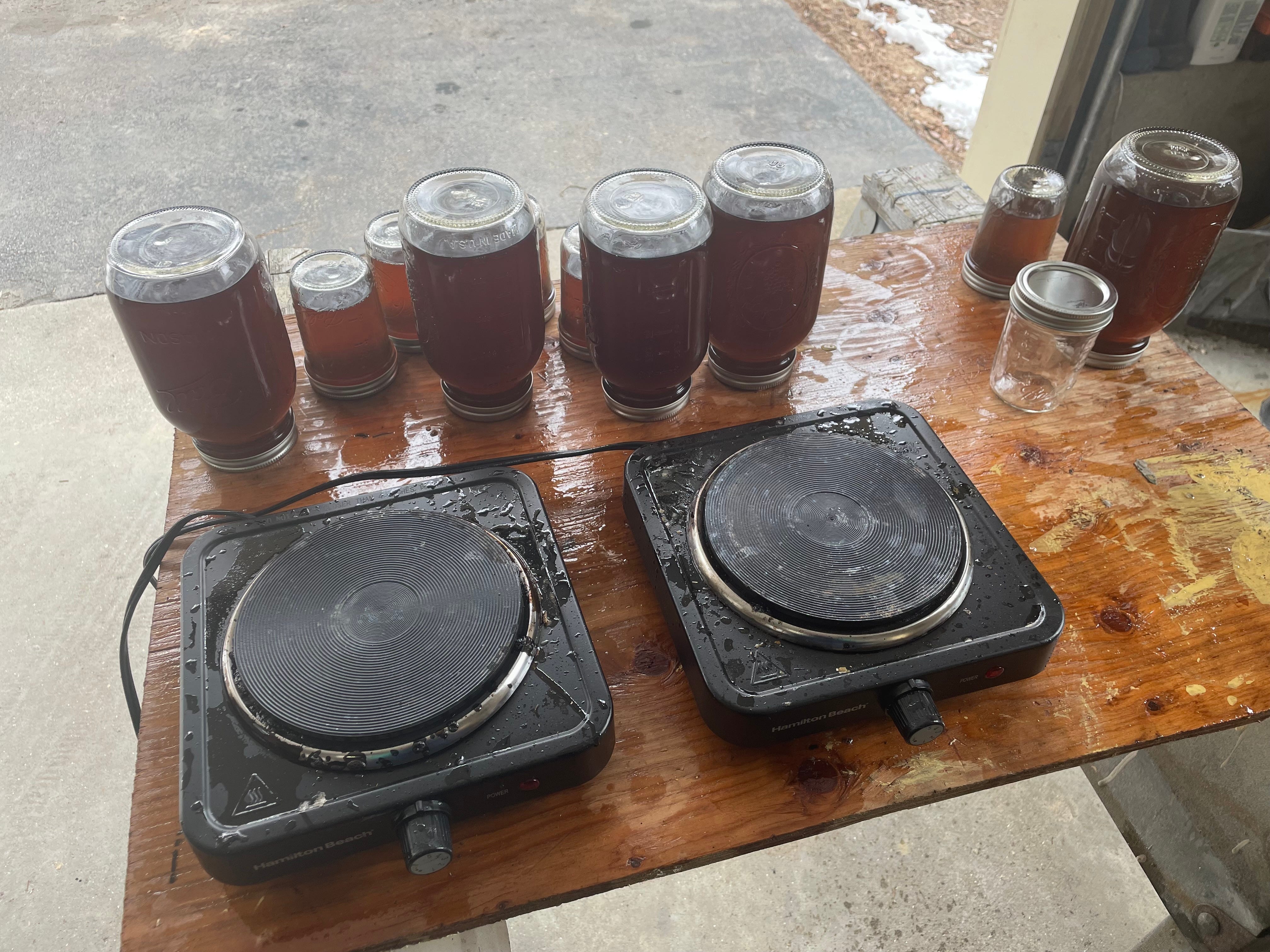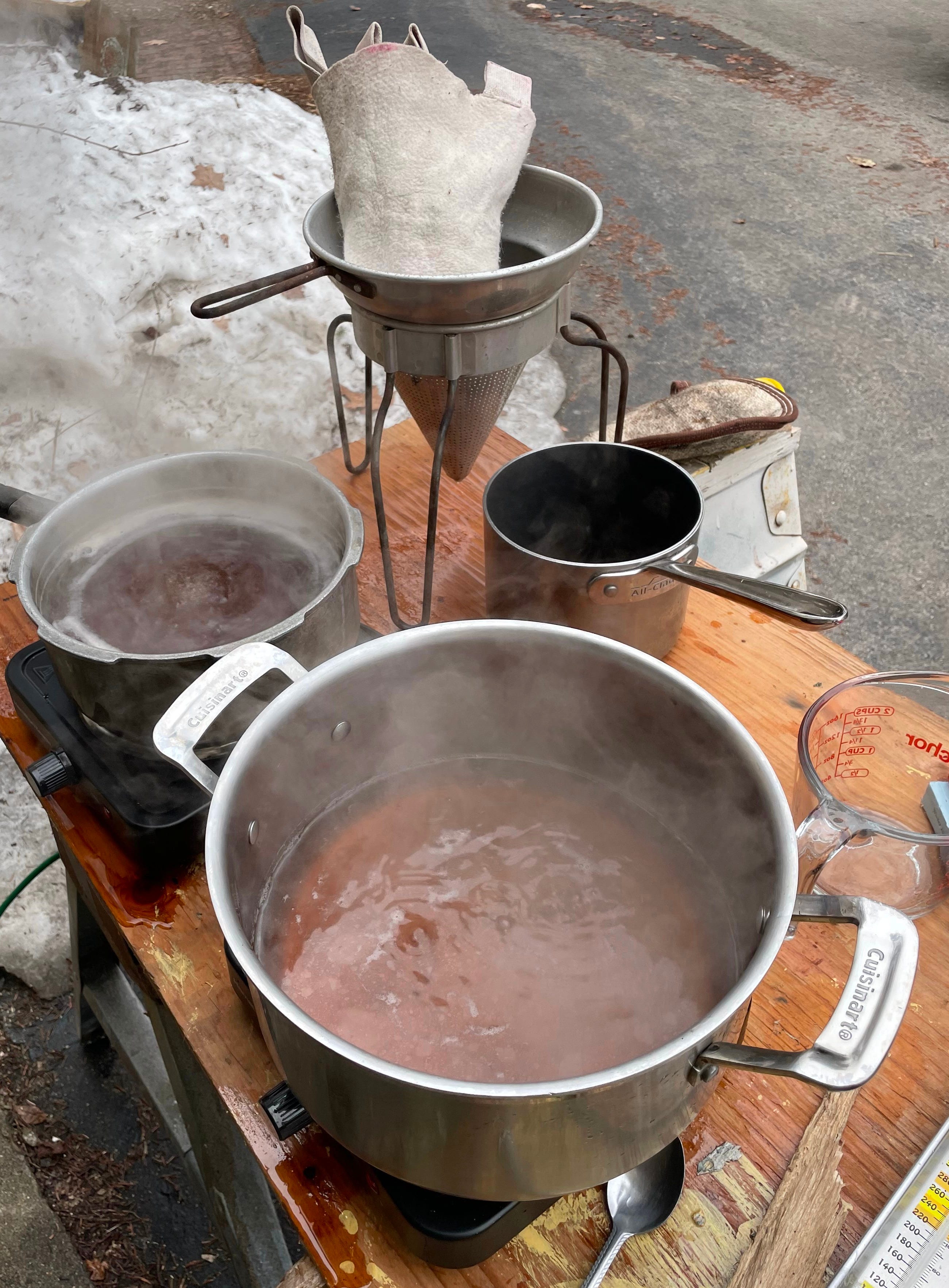 When I got home, he’d set up a table where the final part of the process was happening. There was the cloth filter, capturing all the stuff people wouldn’t want in their syrup; the two just-purchased hot plates, for doing the last part of the boiling; the thermometer, for ensuring that the liquid got to 219 degrees.